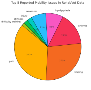 Nearly half of the pets are reported to show discomfort or pain, which is significant. That said, the data is skewed because many owners seek out RehabVet explicitly for pain management or mobility concerns, so we would naturally expect a higher incidence of such cases.